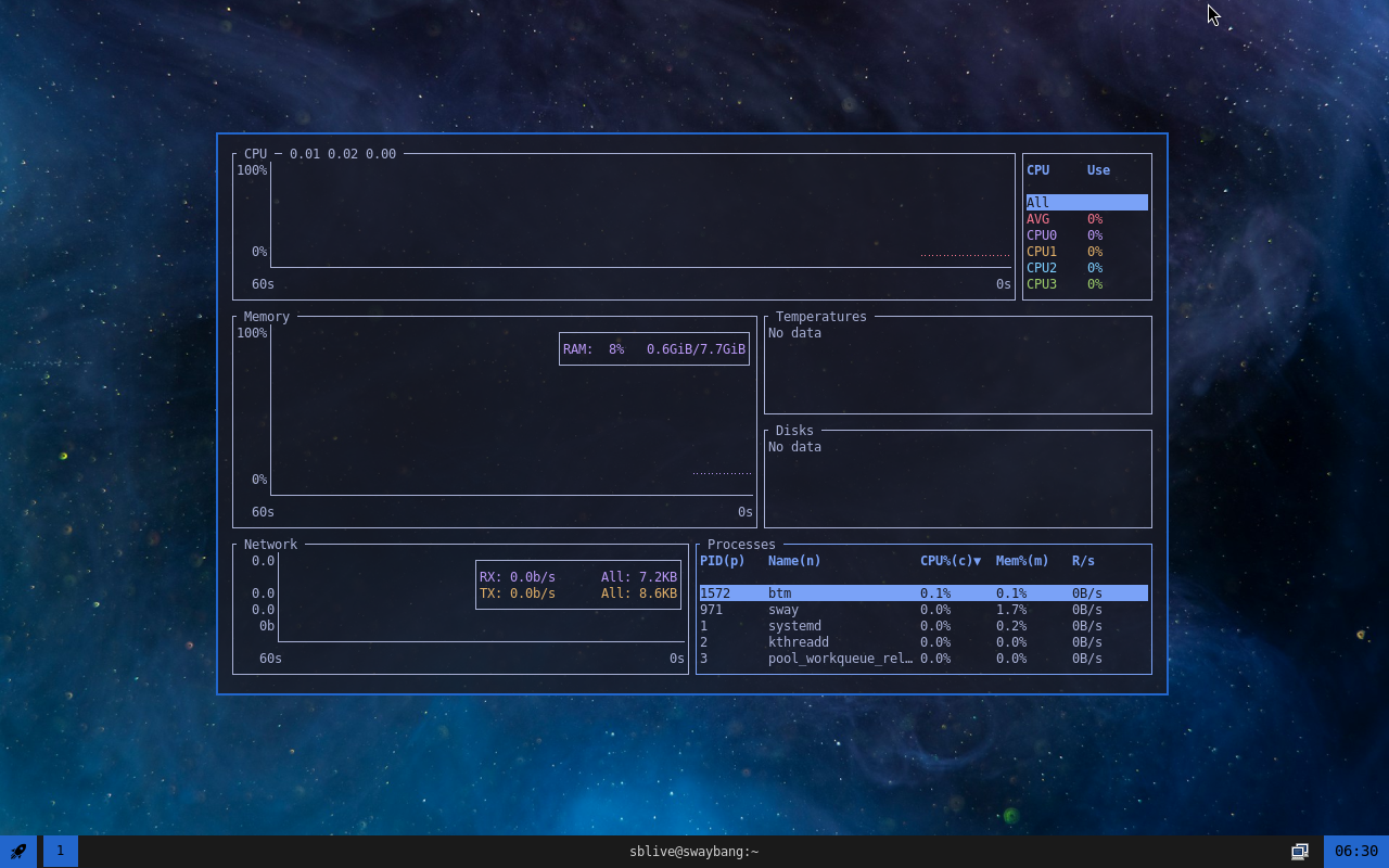 Most of the user interfaces have been updated for a more modern cleaner look. Am thinking of switching out network manager applet for network module which is built into waybar, but need to make sure a user can still access network manager gui easily. As you can see from screenshot battery and volume module do not show up. In a virtual machine it does not find power/battery so will not show anything. Volume control is now via media keys or F9-11 on your keyboard. Wanted to keep bar as clean as possible but still functional.